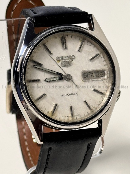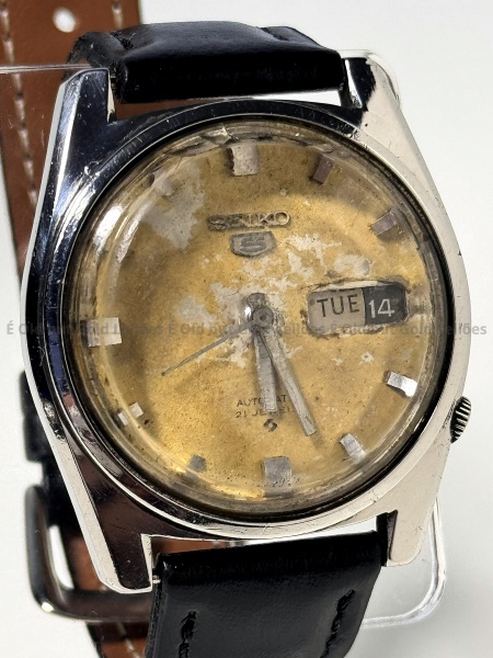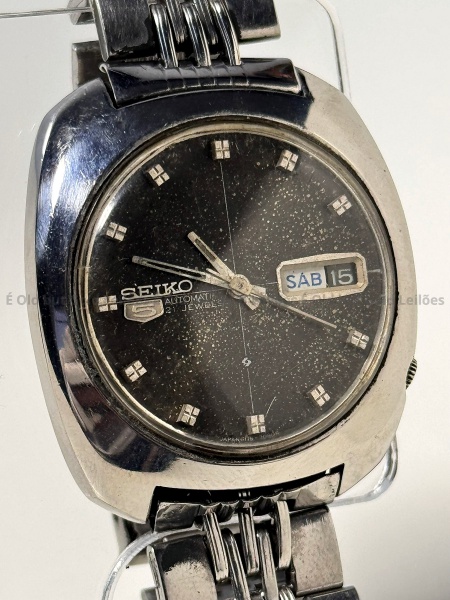 • Seiko - Relógio 5 Automatic - Não funciona - 35mm. Atenção! Os Relógios estão no estado de conservação USADO e não NOVO, portanto podem precisar de revisão ou restauro e podem conter vícios ou defeitos ocultos não mencionados na descrição ou fotos, o funcionamento descrito é apenas sobre a função relógio, questione todas suas dúvidas antes de efetuar os lances, eles são IRREVOGÁVEIS e IRRETRATÁVEIS! Leia os Termos e Condições e a caixa de informações do leilão em Home no site GOLD.LEL.BR dando ênfase nas Informações Importantes, ao efetuar o lance o arrematante concorda com Datas, Prazos e Regras da casa de leilões É Old but Gold. MUITA ATENÇÃO AS FOTOS, solicitações de mais fotos ou dúvidas devem ser enviadas pelo Whatsapp 11 9 8877 2582.