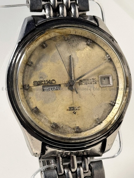 • Seiko - Relógio DX - Não funciona - 38mm. Atenção! Os Relógios estão no estado de conservação USADO e não NOVO, portanto podem precisar de revisão ou restauro e podem conter vícios ou defeitos ocultos não mencionados na descrição ou fotos, o funcionamento descrito é apenas sobre a função relógio, questione todas suas dúvidas antes de efetuar os lances, eles são IRREVOGÁVEIS e IRRETRATÁVEIS! Leia os Termos e Condições e a caixa de informações do leilão em Home no site GOLD.LEL.BR dando ênfase nas Informações Importantes, ao efetuar o lance o arrematante concorda com Datas, Prazos e Regras da casa de leilões É Old but Gold. MUITA ATENÇÃO AS FOTOS, solicitações de mais fotos ou dúvidas devem ser enviadas pelo Whatsapp 11 9 8877 2582.