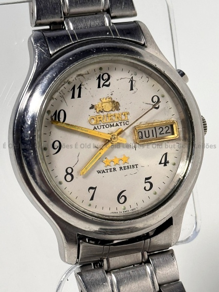 • Orient - Relógio Automatic WR - Funcionando - 39mm. Atenção! Os Relógios estão no estado de conservação USADO e não NOVO, portanto podem precisar de revisão ou restauro e podem conter vícios ou defeitos ocultos não mencionados na descrição ou fotos, o funcionamento descrito é apenas sobre a função relógio, questione todas suas dúvidas antes de efetuar os lances, eles são IRREVOGÁVEIS e IRRETRATÁVEIS! Leia os Termos e Condições e a caixa de informações do leilão em Home no site GOLD.LEL.BR dando ênfase nas Informações Importantes, ao efetuar o lance o arrematante concorda com Datas, Prazos e Regras da casa de leilões É Old but Gold. MUITA ATENÇÃO AS FOTOS, solicitações de mais fotos ou dúvidas devem ser enviadas pelo Whatsapp 11 9 8877 2582.