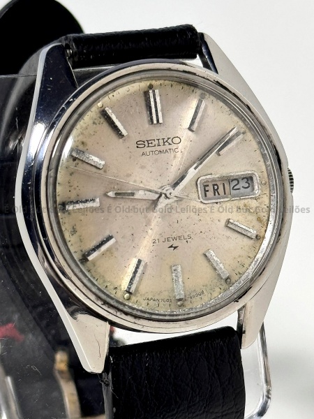 • Seiko - Relógio Automatic - 7006 8000 - Não funciona - 38mm. Atenção! Os Relógios estão no estado de conservação USADO e não NOVO, portanto podem precisar de revisão ou restauro e podem conter vícios ou defeitos ocultos não mencionados na descrição ou fotos, o funcionamento descrito é apenas sobre a função relógio, questione todas suas dúvidas antes de efetuar os lances, eles são IRREVOGÁVEIS e IRRETRATÁVEIS! Leia os Termos e Condições e a caixa de informações do leilão em Home no site GOLD.LEL.BR dando ênfase nas Informações Importantes, ao efetuar o lance o arrematante concorda com Datas, Prazos e Regras da casa de leilões É Old but Gold. MUITA ATENÇÃO AS FOTOS, solicitações de mais fotos ou dúvidas devem ser enviadas pelo Whatsapp 11 9 8877 2582.