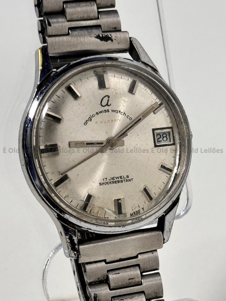 • Anglo Swiss Watch Co - Relógio Cavalry - Não funciona - 32mm. Atenção! Os Relógios estão no estado de conservação USADO e não NOVO, portanto podem precisar de revisão ou restauro e podem conter vícios ou defeitos ocultos não mencionados na descrição ou fotos, o funcionamento descrito é apenas sobre a função relógio, questione todas suas dúvidas antes de efetuar os lances, eles são IRREVOGÁVEIS e IRRETRATÁVEIS! Leia os Termos e Condições e a caixa de informações do leilão em Home no site GOLD.LEL.BR dando ênfase nas Informações Importantes, ao efetuar o lance o arrematante concorda com Datas, Prazos e Regras da casa de leilões É Old but Gold. MUITA ATENÇÃO AS FOTOS, solicitações de mais fotos ou dúvidas devem ser enviadas pelo Whatsapp 11 9 8877 2582.
