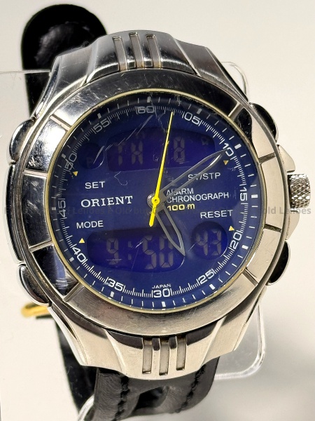 • Orient - Relógio Alarm Chronograph - Funcionando - 43mm. Atenção! Os Relógios estão no estado de conservação USADO e não NOVO, portanto podem precisar de revisão ou restauro e podem conter vícios ou defeitos ocultos não mencionados na descrição ou fotos, o funcionamento descrito é apenas sobre a função relógio, questione todas suas dúvidas antes de efetuar os lances, eles são IRREVOGÁVEIS e IRRETRATÁVEIS! Leia os Termos e Condições e a caixa de informações do leilão em Home no site GOLD.LEL.BR dando ênfase nas Informações Importantes, ao efetuar o lance o arrematante concorda com Datas, Prazos e Regras da casa de leilões É Old but Gold. MUITA ATENÇÃO AS FOTOS, solicitações de mais fotos ou dúvidas devem ser enviadas pelo Whatsapp 11 9 8877 2582.