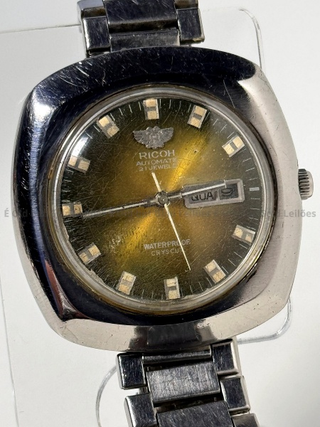 • Ricoh - Relógio Cryscut Automatic - Não funciona - 43mm. Atenção! Os Relógios estão no estado de conservação USADO e não NOVO, portanto podem precisar de revisão ou restauro e podem conter vícios ou defeitos ocultos não mencionados na descrição ou fotos, o funcionamento descrito é apenas sobre a função relógio, questione todas suas dúvidas antes de efetuar os lances, eles são IRREVOGÁVEIS e IRRETRATÁVEIS! Leia os Termos e Condições e a caixa de informações do leilão em Home no site GOLD.LEL.BR dando ênfase nas Informações Importantes, ao efetuar o lance o arrematante concorda com Datas, Prazos e Regras da casa de leilões É Old but Gold. MUITA ATENÇÃO AS FOTOS, solicitações de mais fotos ou dúvidas devem ser enviadas pelo Whatsapp 11 9 8877 2582.